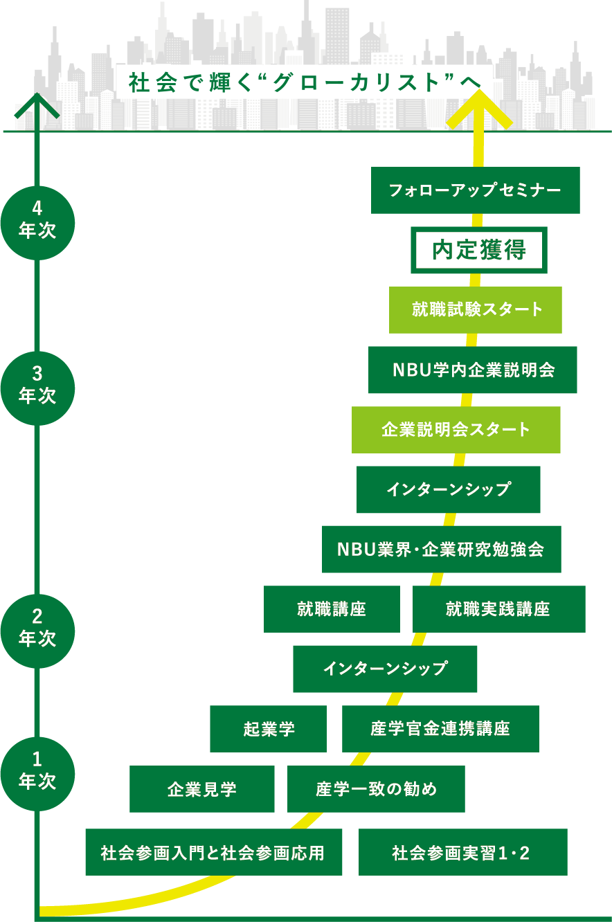 就職試験で必要となる学力・知識・マナーを実践的に習得。長期のインターンシップにも取り組みます。3年次の3月からスタートする企業説明会に向け、業界や企業研究の指導を行います。また同時に、エントリーシート・履歴書の添削指導や面接指導も行います。