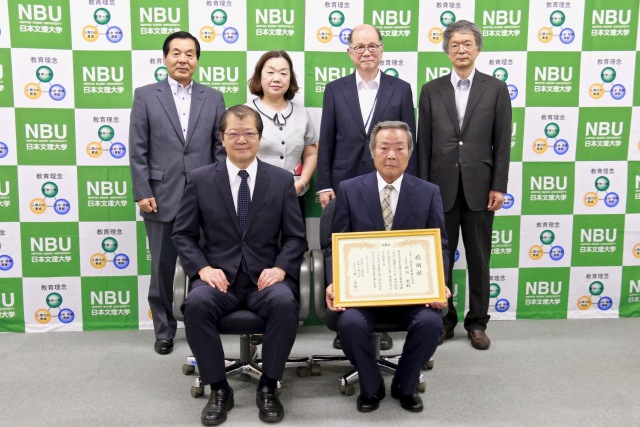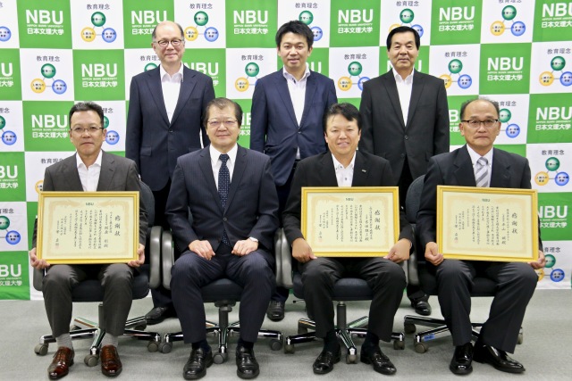 本学創立50周年に際し、多額のご寄付をいただきました皆さまに 菅 貞淑 学長より感謝状を贈呈いたしました。ウメサン株式会社 代表取締役社長 相原 剛 様みずほ証券株式会社 福岡支店 支店長 吉田 雄三 様有限会社山生アーキテクト 代表取締役 平山 誠 様カモンド開発工業株式会社 代表取締役 稗田 寛 様