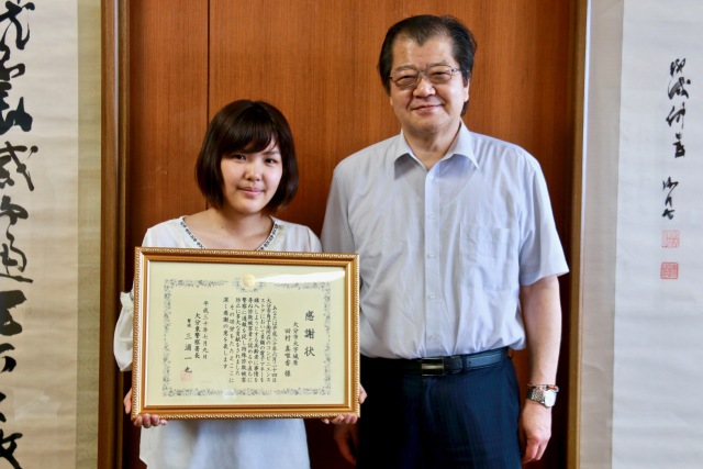 工学部情報メディア学科 1年 田村 真唯香さんが特殊詐欺被害を未然に防いだとして、大分東警察署長より感謝状が授与されました。田村さんはアルバイト先のコンビニエンスストアで、多額の電子マネーを購入しようとする高齢者へ声かけを行い、この行動が特殊詐欺の被害防止に繋がりました。(写真左より、感謝状が授与された 田村さんと 授与の報告を受けた 菅 理事長・学長)なお、田村さんに感謝状が授与される様子が、以下にて放送予定です。テレビ局:OBS大分放送番組名 :OBSイブニングニュース放映日時:2018年7月9日(月)18:15〜18:55※番組の内容は変更になることもあります。予めご了承下さい。