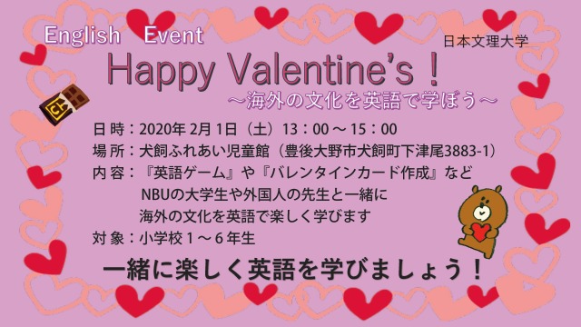 このたび、本学工学部情報メディア学科 こども・情報教育コースで小学校教員を目指して学んでいる学生たちが、本学英語教員(海外出身)と一緒に「海外のバレンタイン文化を英語で楽しく学ぶ」イングリッシュイベントを犬飼の小学生を対象に実施します。【ポイント】・2020年度の小学校での英語教育改革を背景に、小学校教員を目指す学生たちが小学生を対象に楽しく英語を学べるイベントを開催・海外出身の英語教員が海外の文化を英語で小学生に伝える・地域の小学生たちに「歌」や「カードの作成」、「ゲーム」など英語でのアクティビティを通して、海外の文化を学んでもらう地域の方々と連携し、『英語』を通して、学生・教員・小学生が楽しく海外文化を学ぶことのできる本イベントをご取材くださいますようお願いいたします。開催日時 :2020年2月1日(土曜日)13時〜15時開催場所 :犬飼ふれあい児童館(豊後大野市犬飼町下津尾3883-1)実施内容 :「歌」や「バレンタインカード作り」、「○×クイズ」などを通して、英語を使いながら、海外の文化を学ぶ参加者 :本学工学部情報メディア学科 こども・情報教育コース学生、英語教員 犬飼小学校1年生〜6年生 約20名(予定)