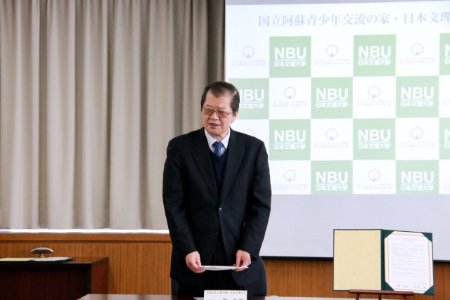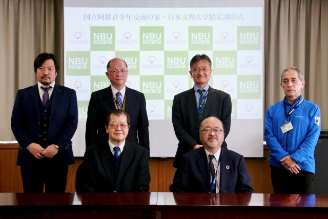 2021年3月3日に本学と独立行政法人国立青少年教育振興機構 国立阿蘇青少年交流の家との連携協力に関する協定を締結し、調印式を開催しました。これまでにも国立阿蘇青少年交流の家における小学生親子を対象とした各種イベント等において、本学の学生がボランティア協力を行ったり、本学の学生対象のボランティア研修等において国立阿蘇青少年交流の家より講師の派遣をいただいたりと様々な交流を行ってまいりました。このたびの協定により、引き続き、これまで以上に様々な交流活動を行うとともに、新たに相互での教職員研修を実施することで、指導者を育成。さらなる若者の人材育成向上を図っていく予定です。