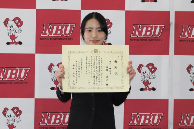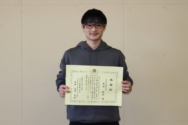 経営経済学部経営経済学科4年 大塚 愛未さん(写真1枚目)、原田 征宗さん(写真2枚目)の2名が、少年の健全育成と非行防止をめざす「大分っ子フレンドリーサポートセンター」において、大学生サポーターとして貢献したとして、大分県警察本部より感謝状が授与されました。「大分っ子フレンドリーサポートセンター」では、本学の学生4名を含む、県内の大学生17名が大学生サポーターとして少年の立ち直り支援活動等に取り組んでいます。この度、卒業を機に大学生サポーターを退任する2名に感謝状が贈られました。