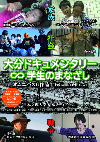 工学部情報メディア学科の学生が、2020〜2022年に制作したドキュメンタリー6作品の上映会「大分ドキュメンタリー∞学生のまなざし」が以下にて開催されます。なお、チケット(一般:1,300円、学生・シニア(60歳以上):1,000円)はシネマ5にて販売しております。日時:6月17日(金)19:00〜、6月18日(土)19:30〜、6月19日(日)19:30〜場所:シネマ5(大分市府内5番街)上映作品:6作品(1時間46分)「眠り姫~母と共に生きる〜」(2021年 演出:森本 吾子美)「天空 あなたが生まれて分かったこと」(2020年 演出:河野 慎冶)「ごみ拾い」(2022年 演出:大塚 建)「92歳戦争体験者のうた」(2021年 演出:大塚 建)「大神の海〜回天生き残り兵の遺言〜」(2022年 演出:河津 祐輝)「命の花壇」(2020年 演出:池見 光士郎)第40回地方の時代映像祭奨励賞受賞作品※上映終了後、作品出演者を交えたトークショー(約30分)も開催予定です。 詳しくはこちら