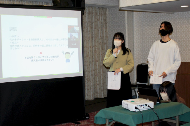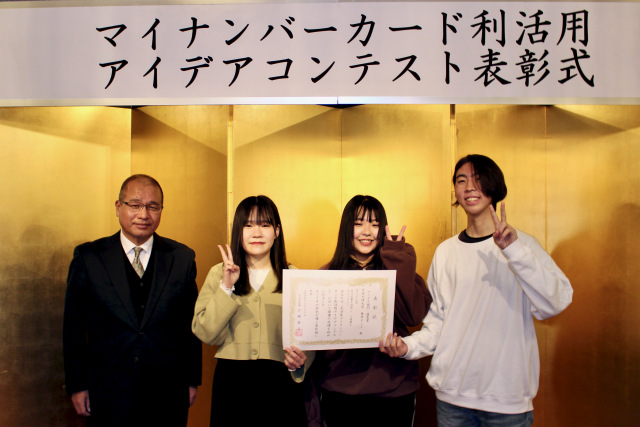 「マイナンバーカード利活用アイデアコンテスト」(主催:大分県)において、経営経済学部経営経済学科の亀井ゼミⅠ(木實 愛海さん、下田 絵梨香さん、原田 楽さん)が「空き容量を活用し、入退場をスムーズに!」のアイデアを提案し、優秀賞を受賞しました。同コンテストには大分県内の企業や学校などから64件の応募があり、プレゼンテーションなどの審査を経て、12月21日の表彰式で表彰されました。
