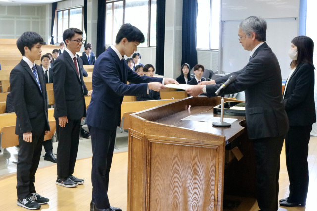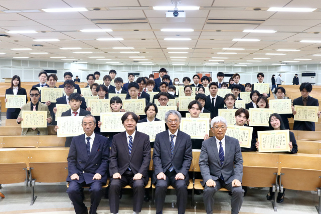 令和6年度学内優秀者表彰の表彰式を開催しました。今年度は学長表彰として、優秀成績賞29名、最優秀課外活動賞3名、優秀研究活動賞1団体および1名、優秀課外活動賞6団体および10名、優秀資格取得賞として3名が表彰されました。また学部長表彰として、奨励資格取得賞13名が表彰されました。