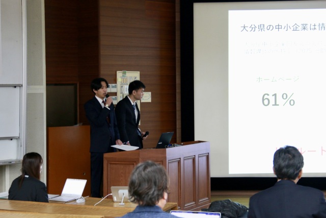 令和7年度卒業研究・論文合同発表会を開催しました。各学科等の代表9研究室が卒業研究・論文を発表し、以下の結果となりました。最優秀賞(第1位)工学部情報メディア学科 出師 毅人さん・高見 光さん(小島研究室)「リクルート動画制作の実践研究~葵会館を例にして~」優秀賞(第2位)工学部機械電気工学科 後藤 尚登さん(大惠研究室)「ArduinoとMyoWareを用いた電気式人工喉頭制御システムへの筋電位信号による抑揚制御機能の実装」優秀賞(第3位)工学部建築学科 山野 響輝さん(池畑研究室)「山国川流域を事例とする土地利用変化の評価手法の検討-土砂動態解明に向けた基礎的分析-」各学科代表工学部航空宇宙工学科 塩崎 一詞さん(中山研究室)「都市間交通における空飛ぶクルマの優位性検討」経営経済学部経営経済学科 吉原 連壮さん(小久保ゼミ)「別府市のふるさと納税受入額を増やすために「ヒットする」ふるさと納税返礼品とは」経営経済学部経営経済学科 小野 幸志郎さん・城間 優士さん・中村 樹作さん(今西ゼミ)「ラグビーでケガが多いのはなぜか?」経営経済学部経営経済学科 尾上 大悟さん(吉本ゼミ)「三菱重工とNECの財務分析~日本の防衛力強化に向けて~」経営経済学部経営経済学科 松門 凜さん(堀ゼミ)「チアリーディングにおけるポジションの違いが最大挙上重量の測定値の正確性に及ぼす影響についての一考察」経営経済学部経営経済学科 牧 詩音さん(河村ゼミ)「発達障害支援による現状と課題」